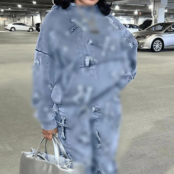 Y0556 Hot Selling Moda Casual Pintado Zipper Hooded Print Conjunto de duas peças para As Mulheres